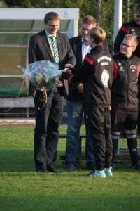 Axel Fette, der Leiter der Netzregion Göttingen und Hardegsen, übergab die Trainingsanzüge und Allwetterjacken mit dem EAM-Logo an unsere Nachwuchsspieler im Beisein des stellvertretenden Samtgemeindebürgermeister Michael Becker.