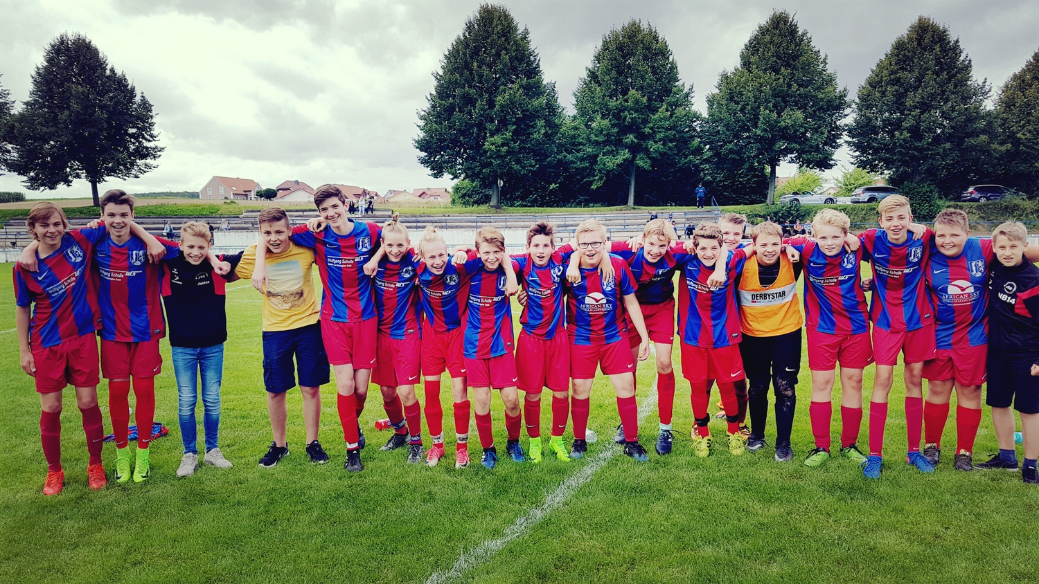 Am Samstag, den 19.08.2017, fand unser erstes Heimspiel der Saison aufgrund eines Sportfestes in Seulingen statt. Kurz nach 13.30 Uhr ist das Spiel unserer JSG Radolfshausen/ Eichsfeld gegen die JSG Dreiflüssestadt vom Schiedsrichter angepfiffen worden. Bereits in der sechsten Minute schoss der Gegner durch eine Unachtsamkeit in unserer Verteidigung das 0:1. Zwei Minuten später wurde wie schon im letzten Spiel Silas Wegstroth im Strafraum gefoult und Timo Gatzemeier verwandelte den Strafstoß sicher zum 1:1. Erneute zwei Minuten später wurde wieder Silas vor dem Strafraum gefoult und diesmal machte unser Stürmer Lennart Schwarze den Freistoß direkt aus ca. 20 Metern rein. Zwei Standardtore nach 10 Minuten! Beide Teams waren hinten nicht sicher, weswegen die Gegner in der 16. Minute wieder ausgleichen konnten. In der Folge hatten wir Glück, dass unsere Gegner ihre Chancen nicht machten. Wir aber machten in der ersten Halbzeit noch drei Tore, zwei von Lennart (21.Min. und 34.Min.) nach Vorarbeiten von Marko und Luis und Marko selbst machte in 22. Minute noch ein Tor nach einer Vorlage von Timo. In der Halbzeitpause sagte uns unser Trainer deutlich wie unzufrieden er mit unserer Defensivarbeit ist und das wir mit dem Halbzeitstand von 5:2 sehr viel Glück hatten, weil die Gegner den Ball nicht hinter die Linie bekommen haben. Durch eine Verletzung mussten wir unseren dreifachen Torschützen Lennart auswechseln und Lukia kam in den Sturm. Direkt in der 37. Minute machte er das 6:2. In der Defensive waren wir aber leider immer noch unsicher und in der 44. Minute schoss Dreiflüssestadt das 6:3. Acht Minuten später, in der 52. Minute, machte Silas noch ein Tor nach Vorlage von Timo. In der 56. Minute kamen die Gegner nochmal gefährlich nach vorne und machten prompt das 7:4. Erst in der 68. Minute kamen wir über Silas auf der Außenbahn nochmal gefährlich nach vorne, doch ein gegnerischer Spieler klärte den Ball. Allerdings kam der Ball zu Tristan an die linke Seitenauslinie, der ihn einfach zurück Richtung Tor schoss und mit viel Glück und Können ging der Ball aus der Distanz tatsächlich ins Tor! In der 69. und 70. Minute schoss Marko noch zwei Tore nach starken Solos zum 10:4 Endstand. Auch wenn das Ergebnis sich hoch anhört, war das Spiel lange nicht so klar wie man anhand des Endstandes vermuten könnte. In der Kabine sagte unser Trainer Matze nochmal seine ehrliche Meinung zu diesem Spiel und das wir großes Glück hatten dass die Gegner ihre Chancen nicht nutzten, während es uns super gelang, fast alle unsere Torchancen auch im Tor unterzubringen! Anschließend feierten wir in der Kabine unseren zweiten Saisonsieg und die vorübergehende Tabellenführung!